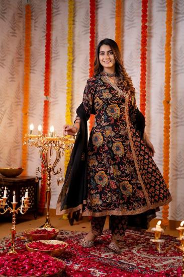 Kantha Work Embroidery Qnd Digital Print Angrakha Anarkali Kurti With Butti Embroidery Dupatta And Printed Pants Yolk Designed Premium Cotton Fabric