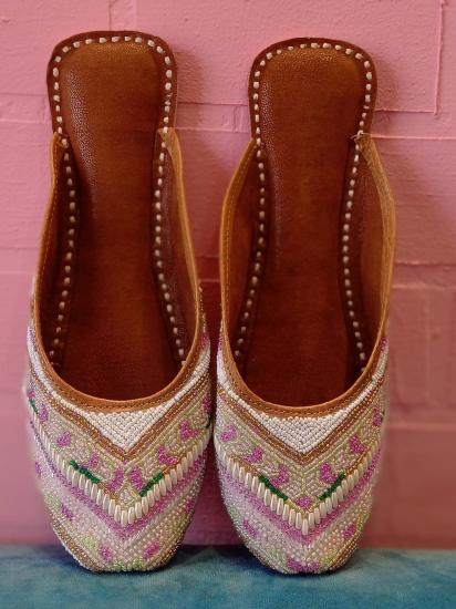 Back Open Slippers Jutti Punjabi Embroidery Pattern White Pink Embroidery