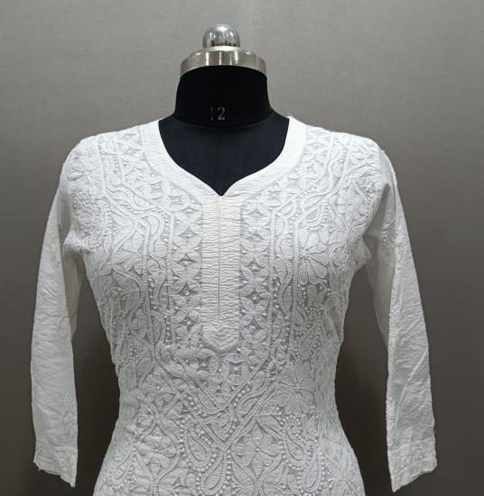 Fully Stitched Full Sleeves Chanderi White Kurti Front Jaal Embroidery