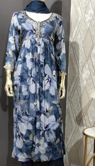Chinon Aliya Cut Hand Work Sequin Embroidery Floral Print Dress With Dupatta And Plazo