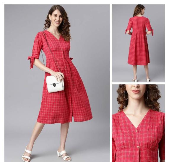 Designer Frock Dress For Women Check Design V Neck Embroidered Knee Length Stylish Sleeves Fabric Cotton
