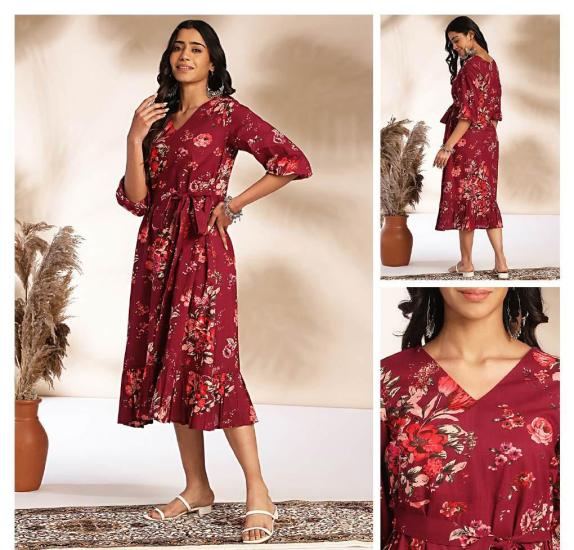 Middy Frock Dress Flower Printed V Neck Stylish Long Frock Dress Design Cotton Fabric Embroidered