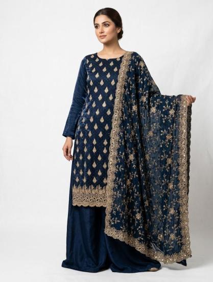 Enhance Your Ethnic Collection With This Stunning Navy Blue Embroidered Kurti Set With Dupatta. The Kurti Is Designed With Fine Embroidery Motifs Spread Evenly Across The Fabric, Giving It A Rich And Classy Appearance. The Bottom Border Has Heavy Detailed Embroidery That Adds A Premium Look To The Outfit. The Set Includes A Beautifully Crafted Net Dupatta Featuring Elegant Floral Embroidery And Lace Border On All Sides, Which Perfectly Matches The Kurti Design. The Color Combination Of Deep Blue With Golden Embroidery Makes This Outfit Ideal For Festive Wear, Wedding Functions, Party Wear, And Traditional Events. The Fabric Feels Soft And Comfortable, Suitable For Long Wear. This Outfit Is Perfect For Women Who Want A Stylish Yet Traditional Look.