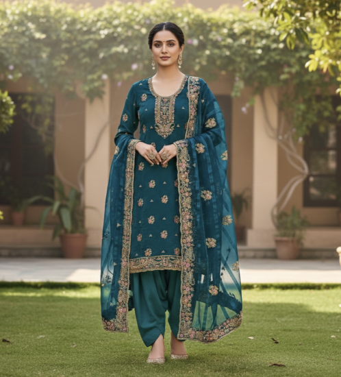 Graceful teal suit set featuring intricate embroidery, paired with a matching dupatta for a timeless festive look.