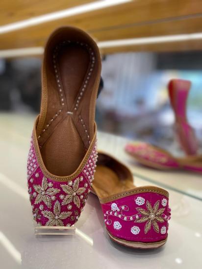 Indulge In The Allure Of Magenta With These Exquisite Punjabi Juttis. Adorned With Intricate Jarkan Handwork, These Juttis Are Tailored For Women With A Size 36 Foot. Their Captivating Shade And Traditional Craftsmanship Make Them A Standout Choice To Elevate Your Look For Any Festive Gathering Or Cultural Celebration, Adding A Touch Of Sophistication And Charm To Your Ensemble.