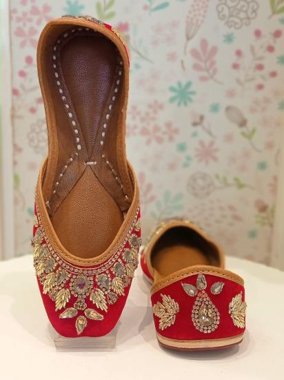This Item Is A Pair Of Punjabi Juttis Designed For Women, Meticulously Crafted From Premium Leather. They Boast Intricate Handwork Embroidery Adorned With Dazzling Jarkan Stones, Exuding Elegance And Sophistication. These Juttis Are A Testament To Traditional Punjabi Craftsmanship, Blending Cultural Heritage With Contemporary Style Seamlessly. Whether Worn For Special Occasions Or Daily Outings, They Are Sure To Add A Touch Of Glamour To Any Ensemble.