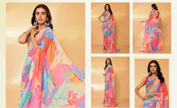 Georgette Floral Printed Saree For Women Open Shoulder Blouse Backless Design Round Neck Party Wear Look Embroidered
