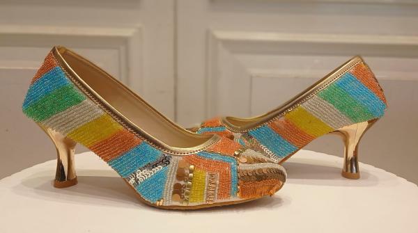 Golden Glamour: Multicolored Embroidered Mules With Pencil Heels, Elevate Your Ensemble With Luxurious Detailing And Vibrant Flair For A Statement-Making Look.