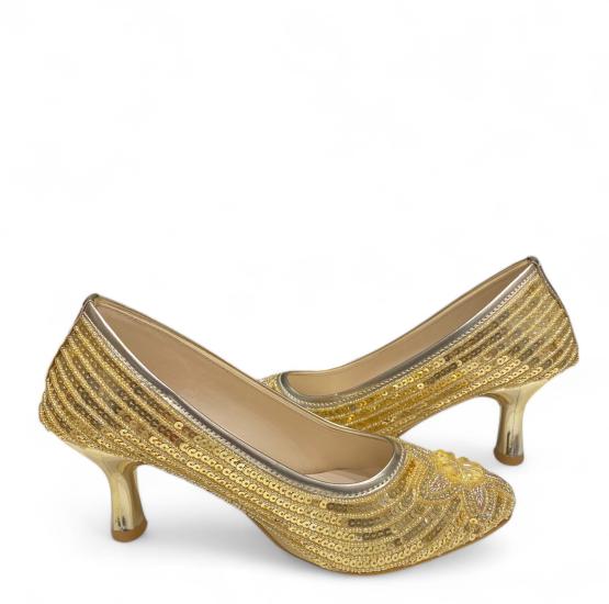 Golden Designer Embroidered Hand Work Pencil High Heels Mules For Women