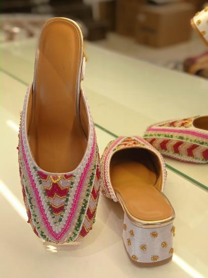 Stone Hand Work Embroidery Party Wear Mules In Heels For Women