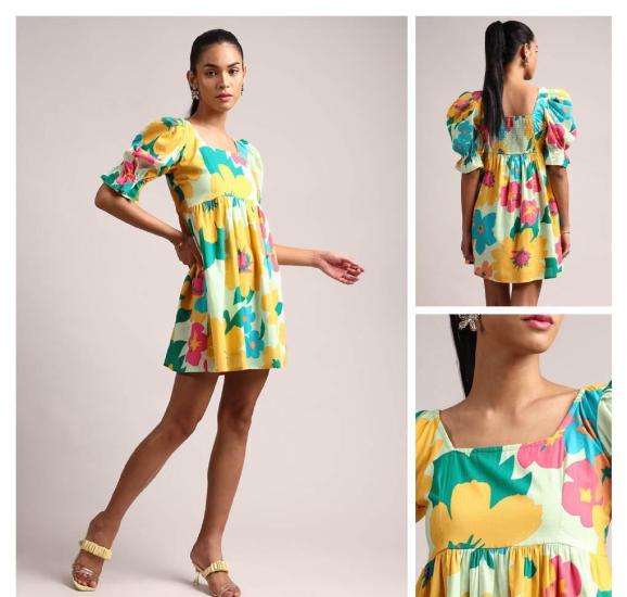 Designer Indo Western Dress Digital Printed For Women Stylish Puff Sleeve Fabric Cotton Dress Embroidered