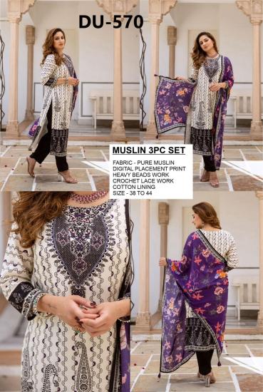 Muslin 3PC Set Fabric Pure Muslin Digital Placement Printed Heavy Beads Crochet Lace Work Cotton Lining