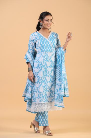 Pure Cotton Printed Angrakha For Women Embroidered Yolk Kurti With Ghera Embroidered Patch And Cotton Printed Dupatta And Cotton Pants