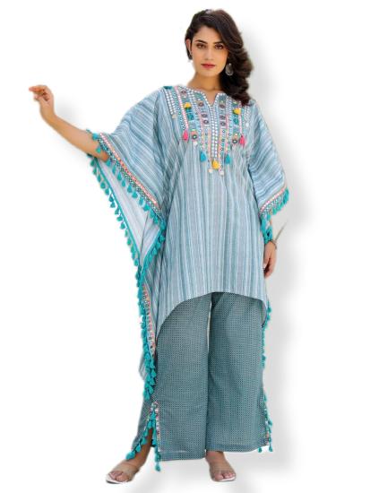 Pure Cotton Printed Kaftaan With Heavy Yolk Embroidery With Pant And Handbag