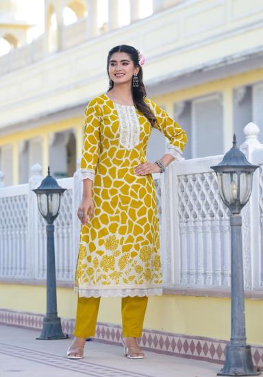 Mustered Colour Digital Printed Fabric Pure Premium Soft Musleen Cotton Embroidered Lace On Neckline Sleeveless And Ghera