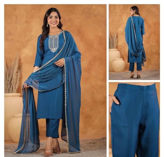 Simple Kurti Pant Party Wear Suit With Dupatta Round Neck Fabric Chanderi