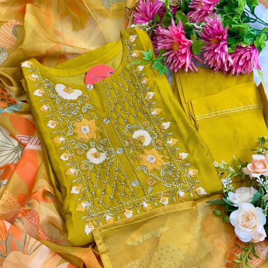 Pure Viscose Silk Top With Taby Digital Printed Dupatta And Hand Work Embroidered And Pant Hand Work Embroidered Also Fully Stitched Trendy Look