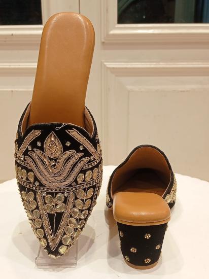 Heavy Black Embroidered Thread Hand Work Mules For Women
